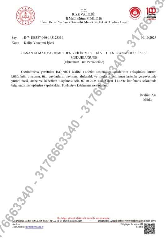 Okulumuzda yürütülen ISO 9001 Kalite Yönetim Sistemi çalışmalarının anlaşılması kurum kültürünün oluşması, tüm paydaşların davranış, alışkanlık ve ilkelerin belirlenen kriterler çerçevesinde yürütülmesi, amaç ve hedeflere ulaşılması için 06.10.2025 tarih ve E-74188387-060-143123319 sayılı resmi yazı doğrultusunda 07.10.2025 Salı Günü 11.45'te konferans salonunda toplantı düzenlenecektir.